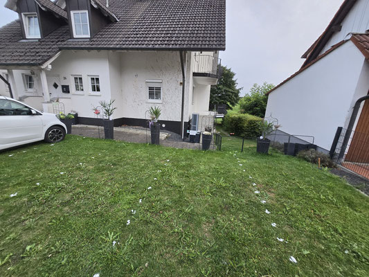 Direkt vor dem Haus stehen Ihnen Parkmöglichkeiten zur Verfügung. Es handelt sich um begrünte Stellplätze mit stabiler Gitterverstärkung, auf denen Sie Ihr Fahrzeug abstellen können. Der Eingang befindet sich rechts am Haus: Gehen Sie dazu rechts am Garten entlang, der Zugang liegt im unteren Bereich hinter dem Haus.